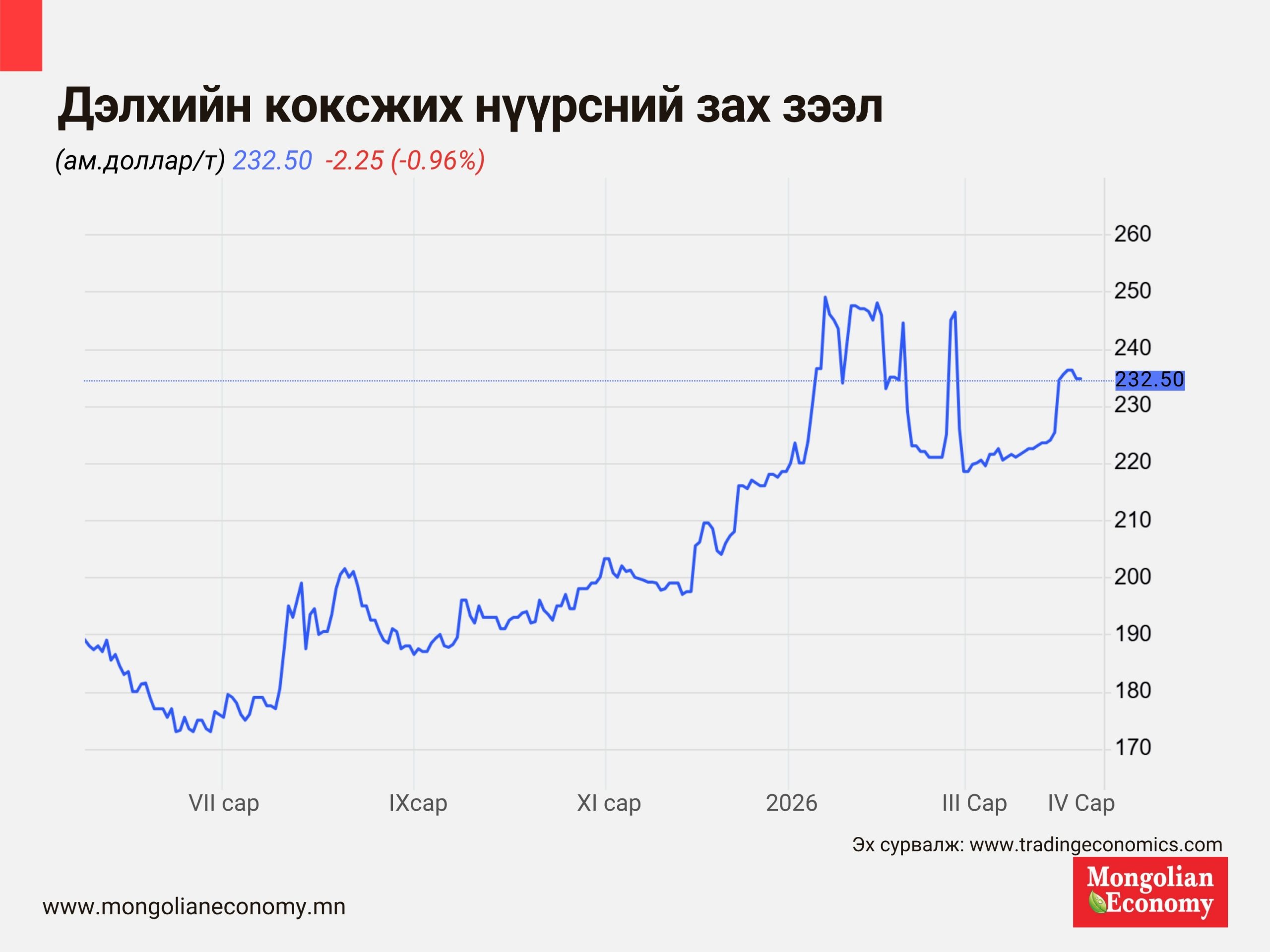Харин олон улсын зах зээл дээр коксжих нүүрсний үнэ харьцангуй тогтвортой, өсөх хандлагатай байна. “Trading Economics”-ийн мэдээлснээр 2026 оны дөрөвдүгээр сарын 7-ны байдлаар коксжих нүүрсний үнэ тонн тутамд 234.75 ам.долларт хүрч, сүүлийн нэг сард 5.98 хувь, жилийн дүнгээр 22.58 хувиар өсжээ. Гэвч энэ өсөлт нь санхүүгийн зах зээл дээрх “CFD” арилжаанд суурилсан үзүүлэлт бөгөөд бодит биет нийлүүлэлтийн зах зээлд, тэр дундаа Монголын экспортын гол чиглэл болох Хятадын зах зээл дээр эрэлт сул хэвээр байгаа нь үнийн дарамтыг богино хугацаанд хадгалах хүчин зүйл болж байна.