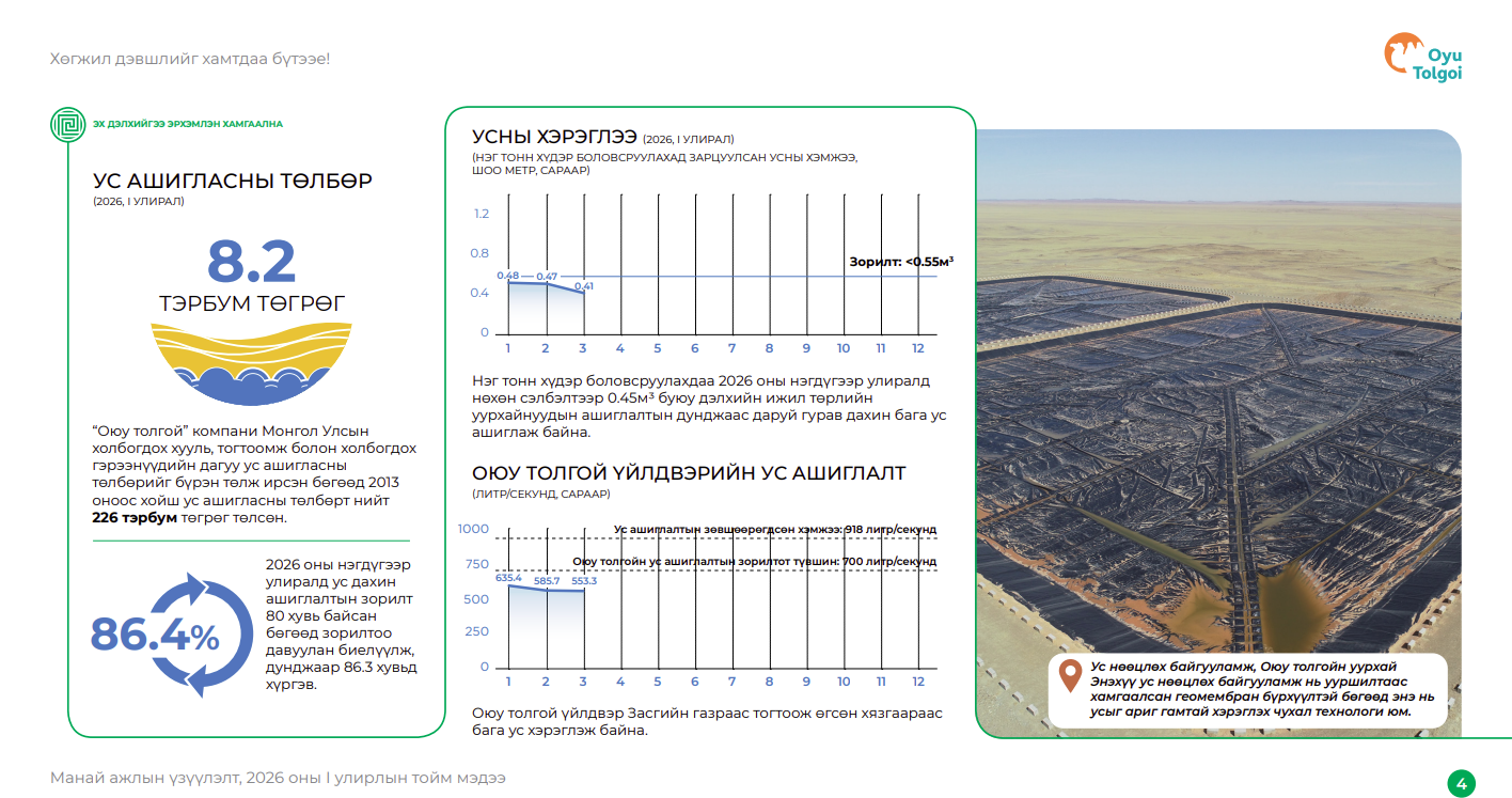 Усны үзүүлэлт энэ утгаараа эмзэг боловч зайлшгүй ярих сэдэв юм. Оюу толгой компани 2013 оноос хойш ус ашигласны төлбөрт 226 тэрбум төгрөг төлжээ. Харин 2026 оны эхний улиралд ашигласан усныхаа 86.4 хувийг дахин ашигласан, нэг тонн хүдэр боловсруулахад 0.45 м³ ус нөхөн сэлбэлтээр авч хэрэглэсэн байна. Энэ нь дэлхийн ижил төрлийн уурхайнуудын дунджаас гурав дахин бага хэрэглээ гэж тайланд дурдсан байна.