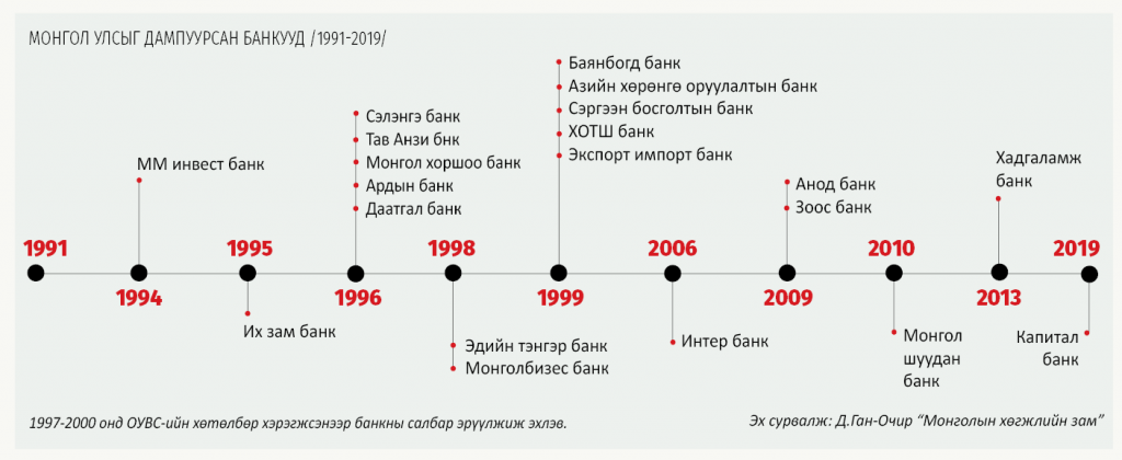 Өмнөх нийгэмд банкны үүргийг зөвхөн Төвбанк гүйцэтгэдэг байсан бол 1991 онд Улсын Бага Хурлаас Банкны тухай хуулийг баталснаар зах зээлийн харилцаанд нийцсэн хоёр шатлалт банкны тогтолцоо үүссэн. Уг хуулиар улсын Төвбанк арилжааны банкуудаа хянаж, мөнгө, зээлийн бодлогыг эрхлэн явуулж, арилжааны банкууд иргэд, үйлдвэр завод, компаниудад санхүүгийн төрөл бүрийн үйлчилгээ үзүүлэх зохицуулалт хийсэн юм. Ийнхүү 1992 онд арилжааны зургаан банк үйл ажиллагаа явуулж байсан бол 1995 онд 13 болж нэмэгдсэн бөгөөд энэ завсар дампуурсан банк ч хэд хэд бий.