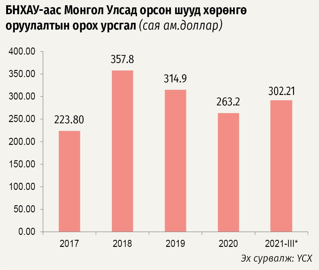 Хөрөнгө оруулалт нь улс орны эдийн засгийн өсөлт, хөгжлийг тэтгэх гол механизм болдог. БНХАУ манай улсын тэргүүлэгч хөрөнгө оруулагчдын тоонд багтдаг бөгөөд 2017-2021 оны хооронд 1.4 тэрбум ам.долларын шууд хөрөнгө оруулалт хийсэн байна. 2021 онд манай улсад оруулсан шууд хөрөнгө оруулалт 302.21 сая ам.долларт хүрсэн нь 2020 онтой харьцуулахад 39.1 сая ам.доллараар өссөн  үзүүлэлт юм. Ковид-19 цар тахлаас үүдэн хоёр улсын хилийн боомтын хязгаарлалт зэрэг нь шууд хөрөнгө оруулалтын хэмжээг бууруулахад нөлөөлжээ.